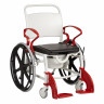 Кресло-коляска имеет 4 маленьких и 2 больших задних съемных колеса. Большие колёса позволяют пользователю передвигаться на стуле без посторонней помощи. Тормоза на каждом колесе позволяют зафиксировать кресло на месте, если это необходимо. Подножки кресла-туалета можно снять.